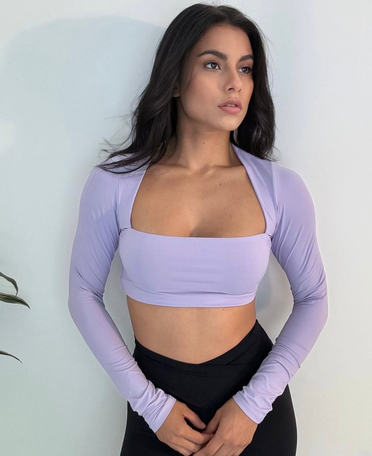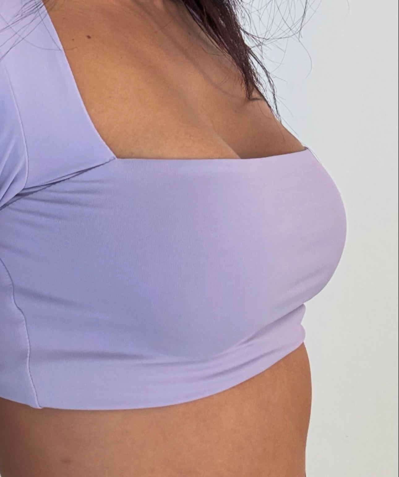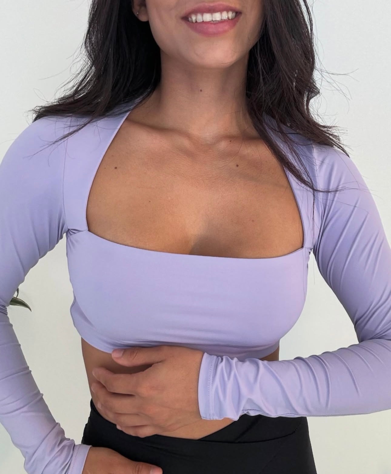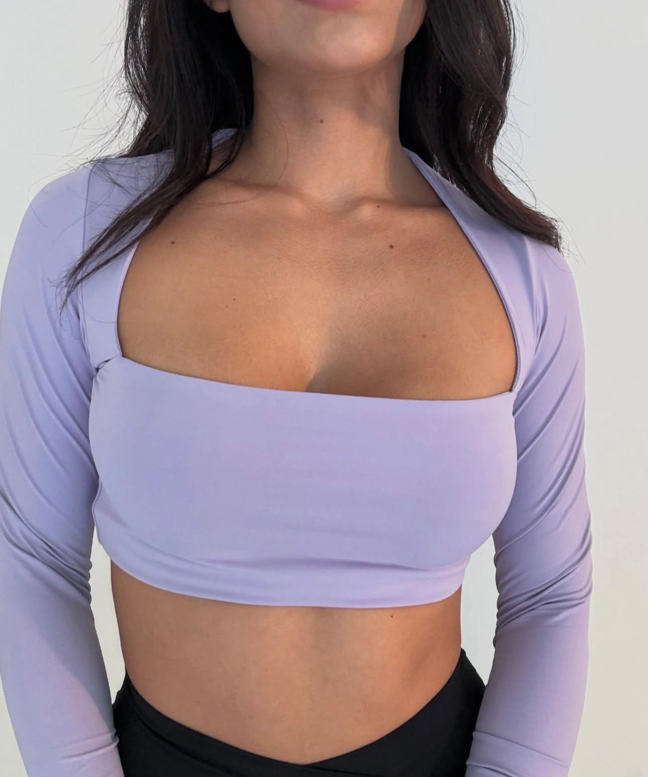 Top deportivo de manga larga en color lavanda, con escote recto que realza el busto y brinda un look sofisticado pero atrevido. Su diseño de hombros estructurados y ajuste ceñido al cuerpo te ofrece soporte moderado y comodidad al mismo tiempo. Ideal para entrenamientos de baja y media intensidad o para combinar con tu outfit urbano.