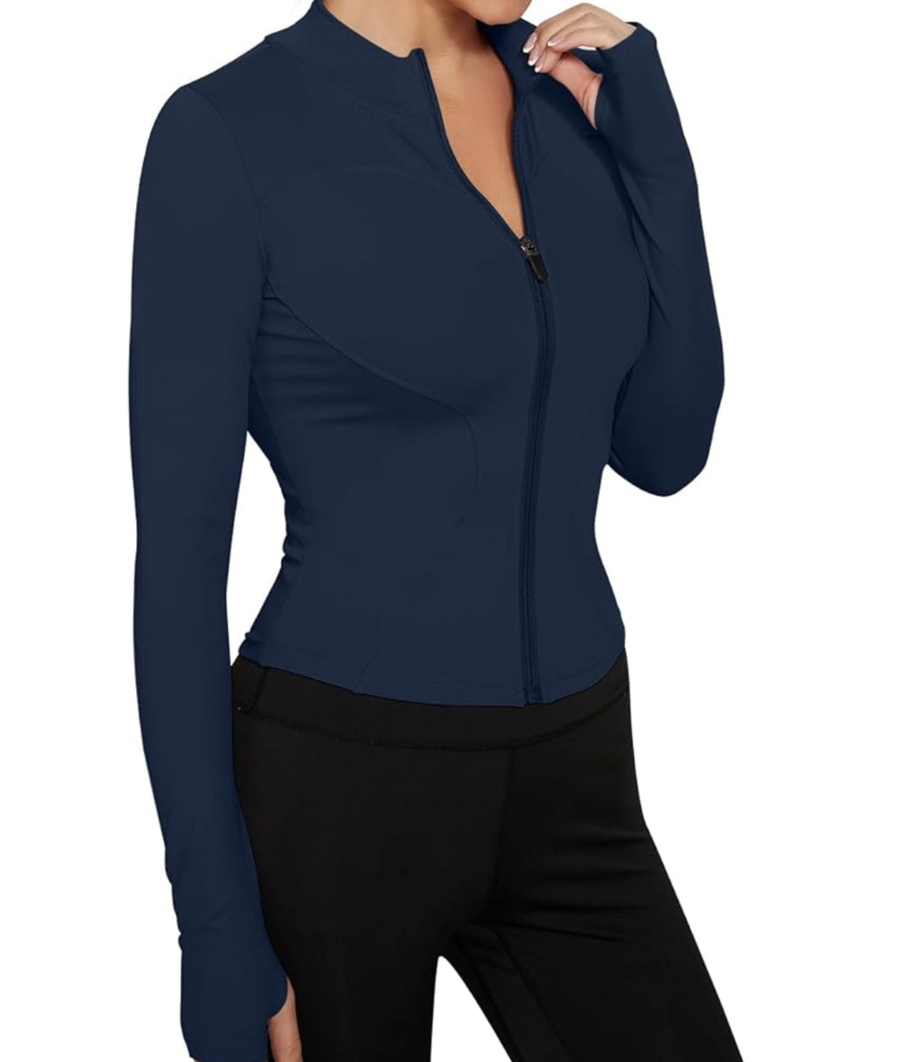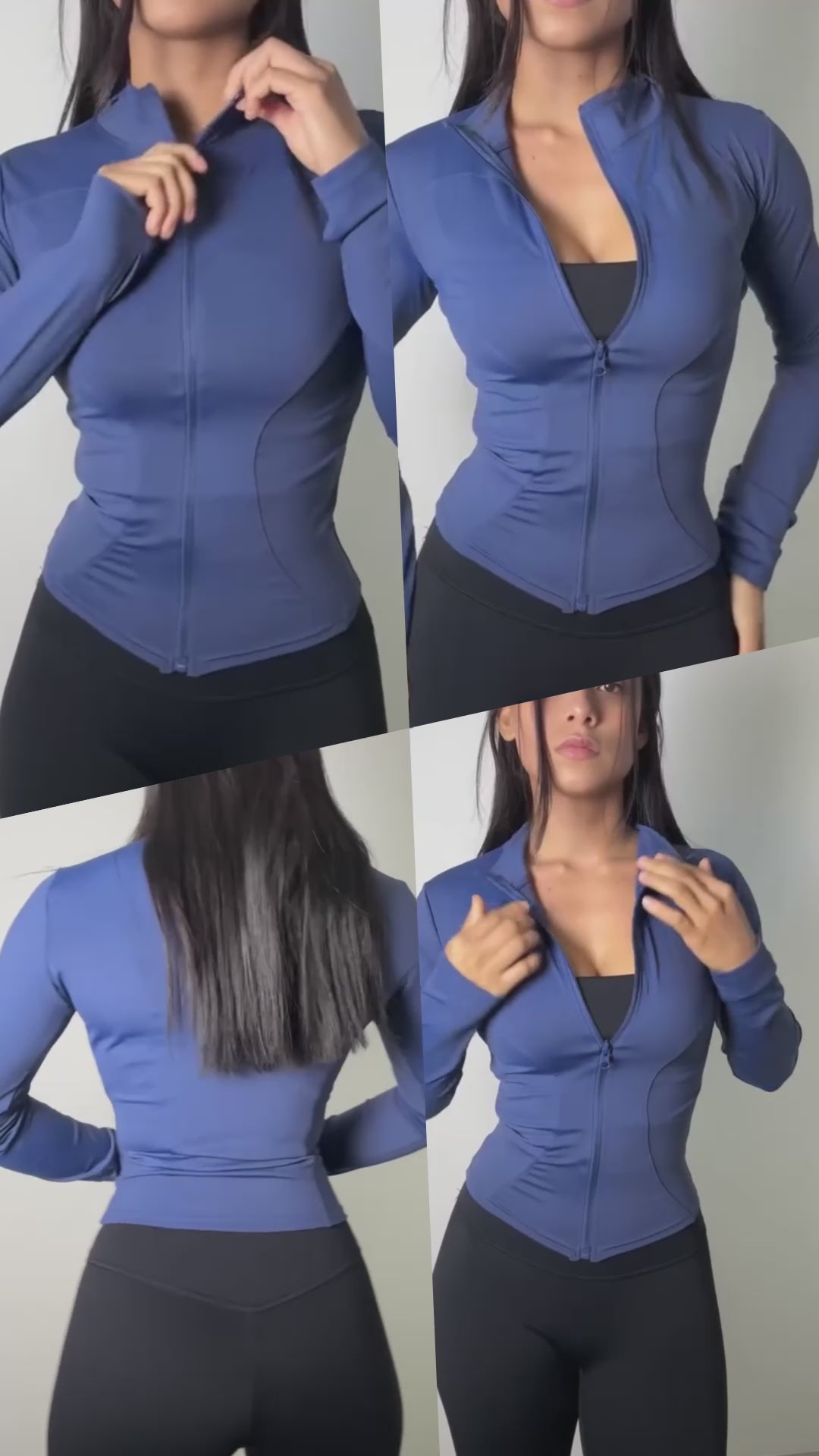 Fabricada en tela deportiva elástica, suave y ligera, es ideal para entrenar, correr o salir con estilo. Cuenta con cremallera completa, cuello alto y orificios para el pulgar que protegen del sol o del frío.