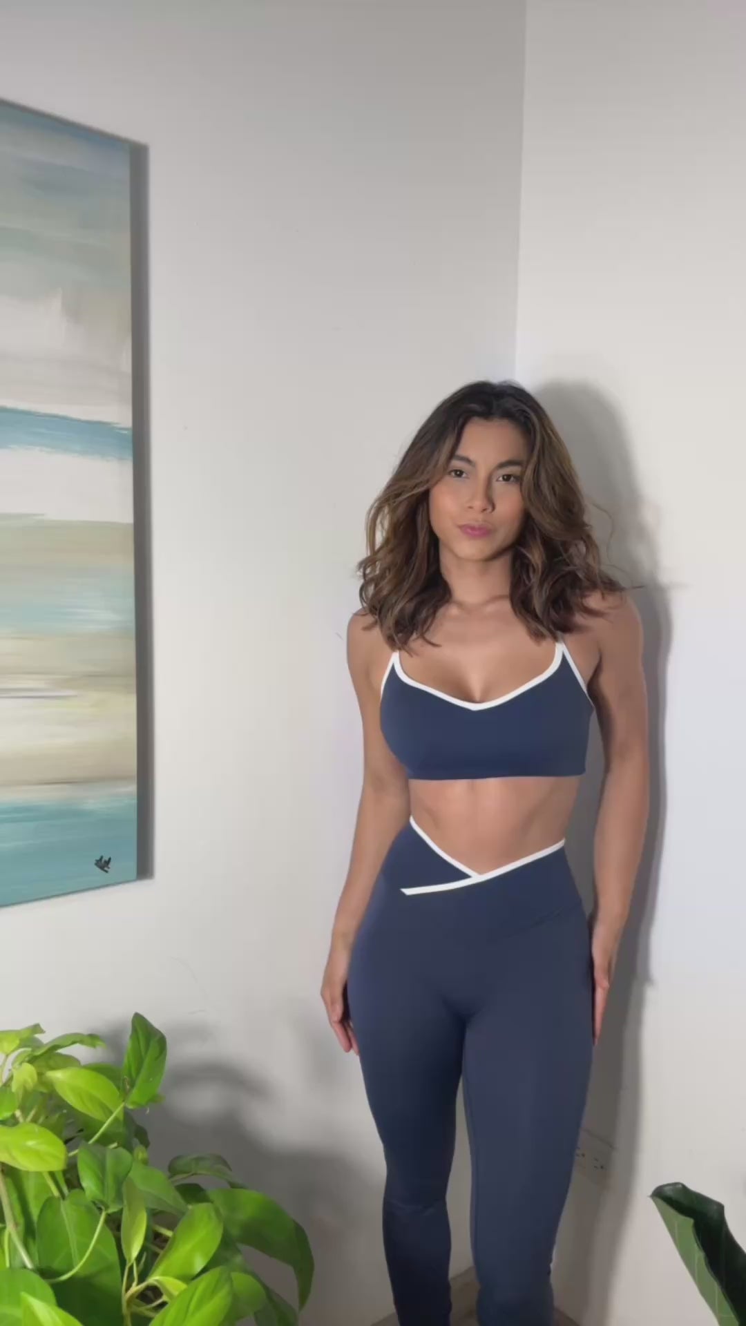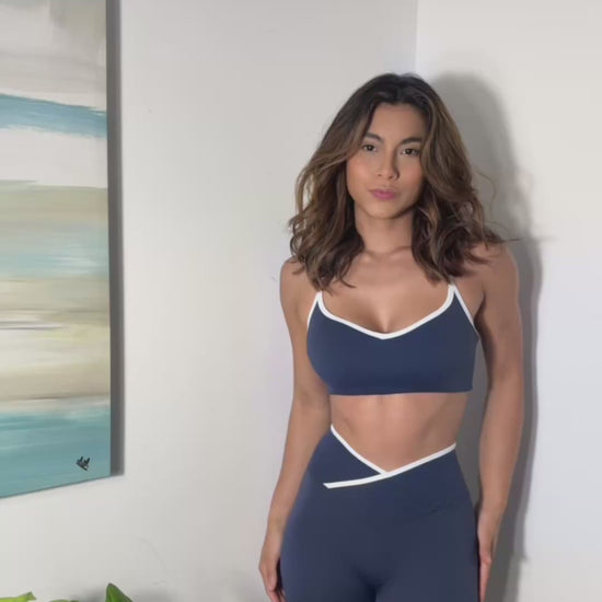 El Set Azul Navy Curve combina elegancia y soporte en cada movimiento. Su corte cruzado en cintura realza la figura, mientras el contraste en blanco le da un toque moderno y sofisticado. Ideal para entrenamientos intensos o looks deportivos con estilo.