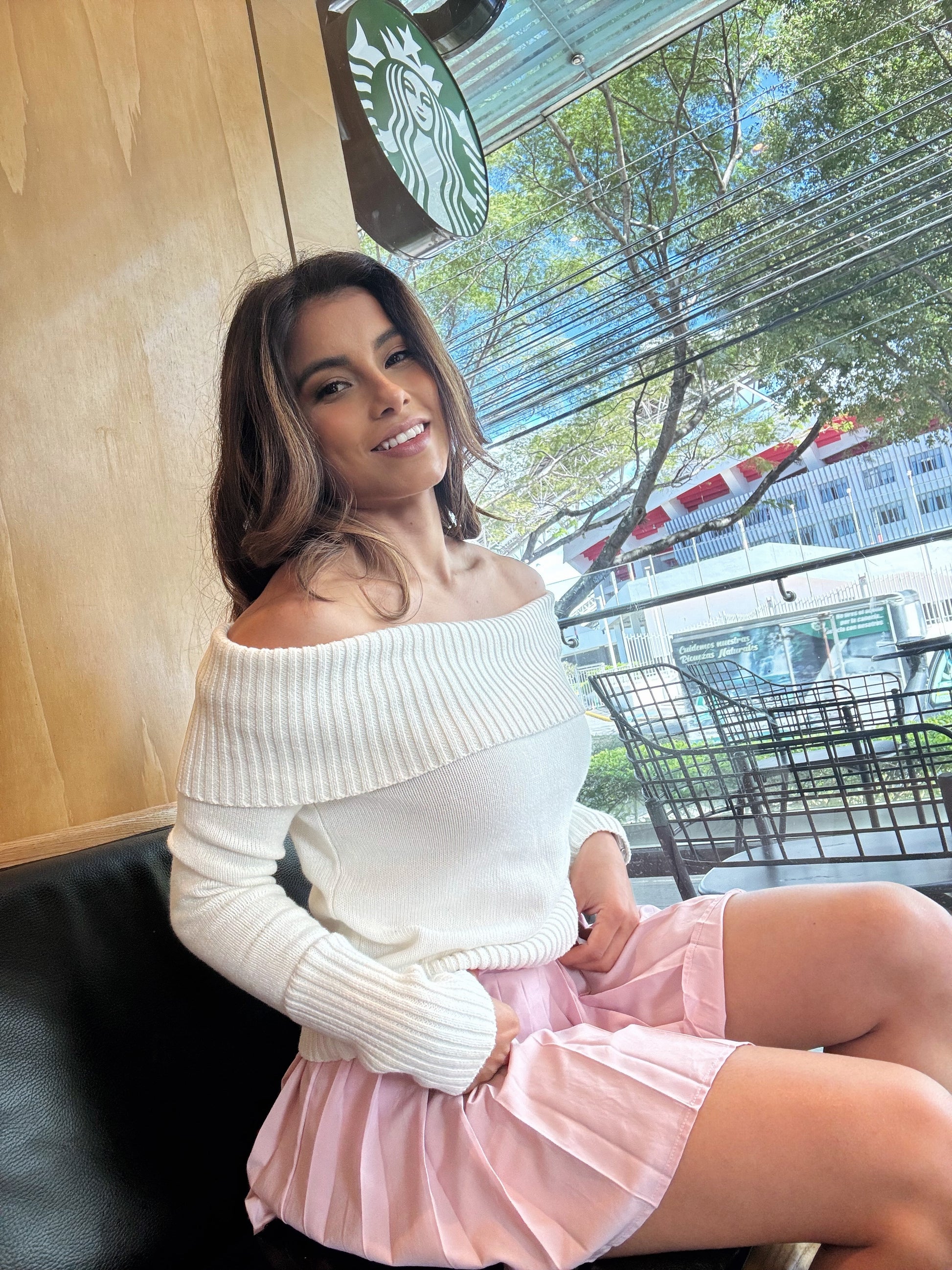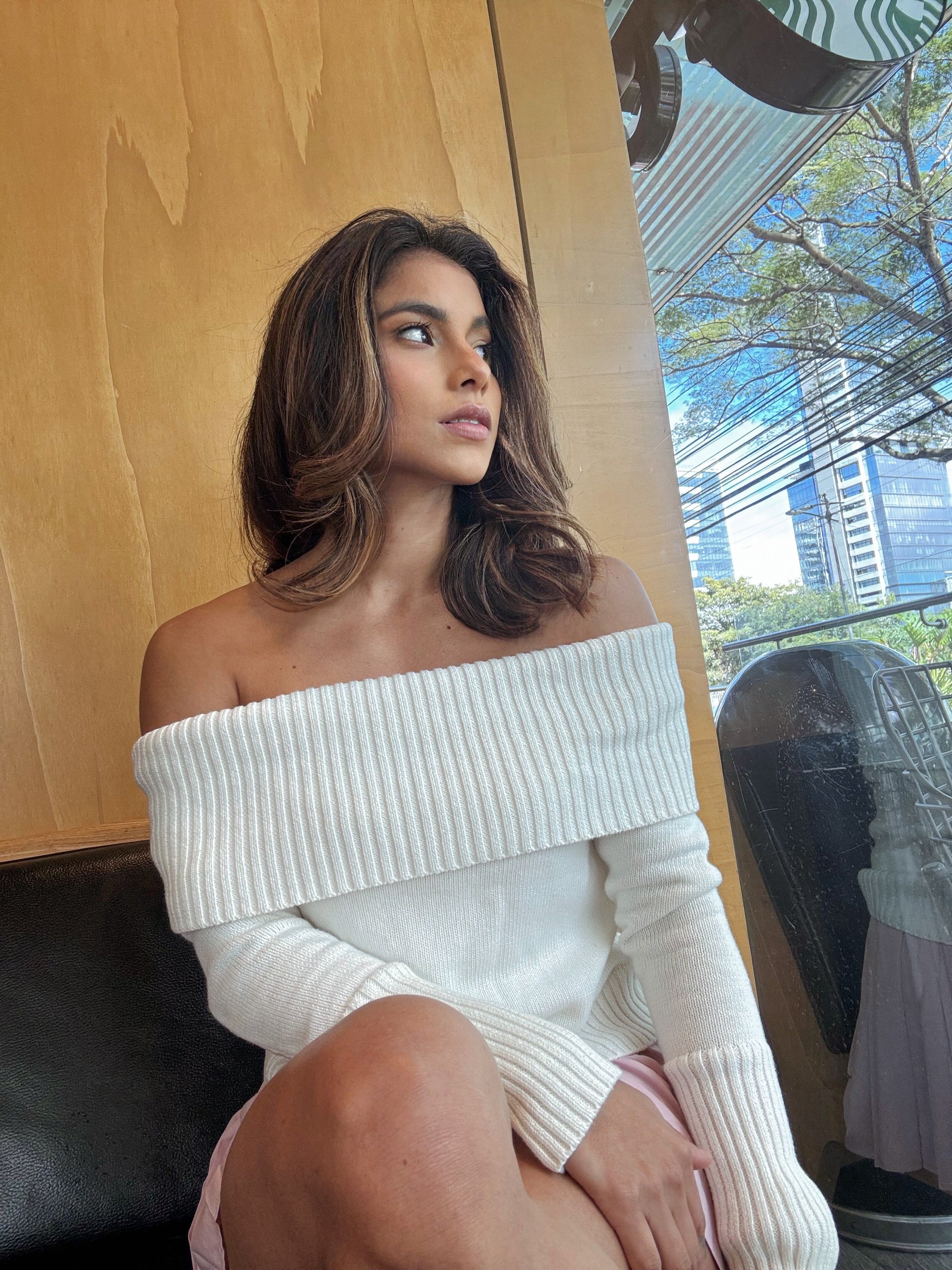 El Suéter Amore tiene un diseño romántico y elegante con hombros descubiertos que realzan la figura de forma delicada. Su tejido acanalado grueso aporta calidez, comodidad y un look chic perfecto para días frescos.